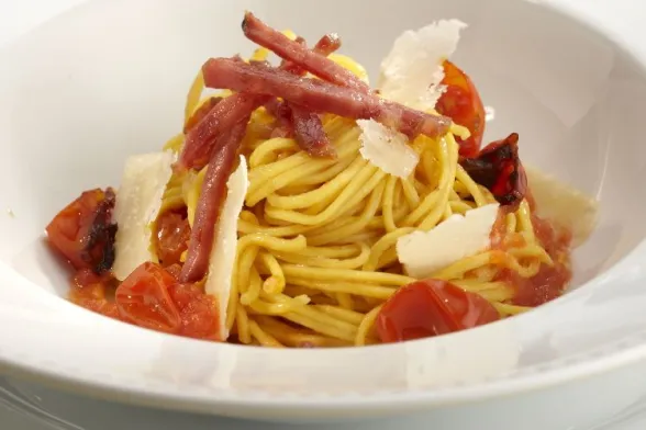 Tagliare i pomodori in due, e in una larga padella antiaderente mettete l’olio, il rosmarino, l’aglio intero schiacciato e disponete i pomodorini tagliati rivolti verso il basso fino a coprire tutto il fondo. Fateli cuocere senza girarli fino a che non assumono una consistenza quasi bruciacchiata, salateli e spegnete. Tagliate la soppressata a julienne, mettetela in un padellino senza nessun condimento e fatela rosolare piano in modo da perdere un poco di grasso e farla diventare croccante. Cuocete la pasta in abbondante acqua salata per pochissimi minuti mantenendo un bicchiere di acqua di cottura. Mantecare i capelli d’angelo con pecorino romano grattugiato e servite in piatto aggiungendo i pomodori bruciati, una julienne di salame croccante e scaglie di pecorino.
