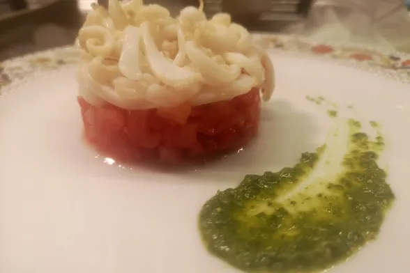 Con un coppapasta creare un cilindro con pomodoro e seppia. decorare con gocce di pesto.