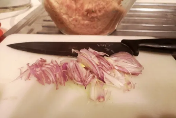 In un tegame mettere tre cucchiai di olio con due scalogni tagliati a fettine sottili, un goccio di acqua per non bruciarla e un pizzico di sale. Lasciarla stufare finche non diventa trasparente, aggiungere la polpa di pomodoro, aggiustare di sale e pepe e farla cuocere per qualche minuto quindi mettere nel pomodoro le polpette e coprire con il coperchio,