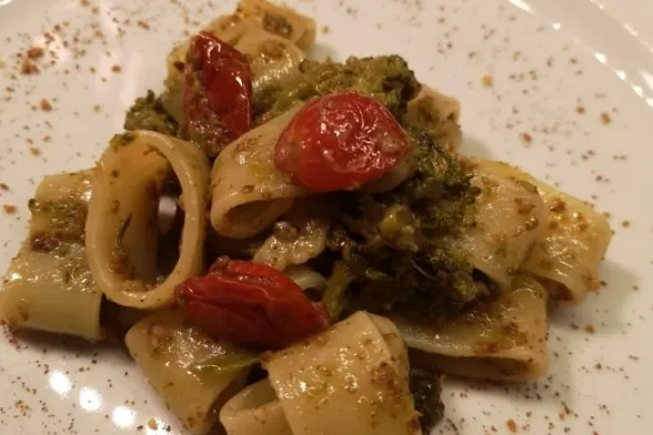 Mettere nel piatto la pasta condita e spolverare con il restante pane grattuggiato e una spolverata di pecorino.