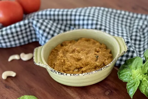 Fare a pezzi i peperoni e metterli nel boccale del frullatore. Unire i pomodori a pezzi, gli anacardi, olio evo generoso, basilico e frullare. Unire un pezzetto di aglio, se gradito. Aggiustare di sale e frullare ancora. Lasciare gli anacardi leggermente tritati in modo grossolano perché regaleranno croccantezza al pesto.