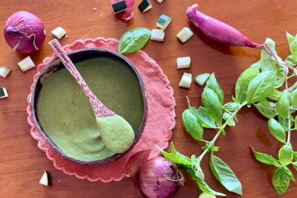 Prendete le zucchine del tipo verde scuro, (non le romanesche) e tagliatele a pezzi. Tagliate una bella cipolla rossa a fettine. In un tegame versate un filo d’olio insieme con la cipolla e fate scaldare l’olio. A questo punto unite le zucchine a pezzi, aggiustate di sale e aggiungere un bicchiere di acqua. Lasciate cuocere a fiamma medio bassa per circa 20 minuti. Sì gradito potete unire anche del peperoncino fresco. Una volta spento il fuoco aggiungete delle foglie di basilico fresco. Frullate le zucchine ancora calde fino ad ottenere una crema omogenea e servite.