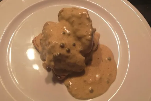 Porre sul piatto il crostone di pane casereccio, mettere il filetto sul pane e ricoprire il tutto con la salsa di panna senape e pepe.