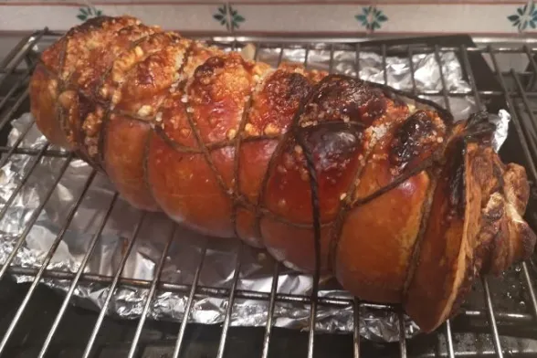 Cuocerla in forno su una teglia bucata dopo aver cosparso la cotenna di olio e sale grosso a 160 gradi per 1 ora e 45 minuti e per finire, a 210 gradi per 7 minuti.
