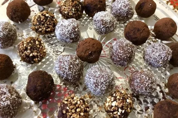 Sbriciolare i biscotti, mettere dentro un contenitore assieme allo zucchero, il cacao, la panna e le nocciole, amalgamare tutto per ben. Modellare le palline, da parte in un piattino, mettere un po’ di cacao amaro, passare i tartufi. Prima di servire mettere in frigo un’ora e mezzo