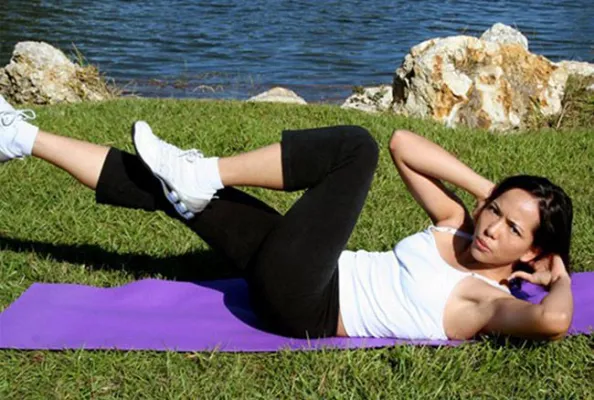 (www.melarossa.it) Bicycle crunch: Con la schiena ben appoggiata a terra e le mani dietro le orecchie, alza le gambe a formare un angolo di 90°. Quindi, porta il ginocchio sinistro verso il petto e ruota il gomito destro verso la gamba sinistra. Ripeti dell?altra parte. Mentre porti una gamba verso il petto allunga l?altra verso l?esterno. Copyright: Shutterstock.com