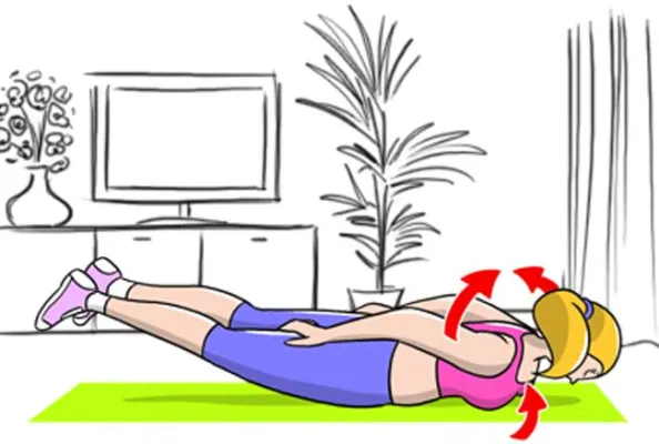 (www.melarossa.it) Raddrizza il busto: Pancia a terra, gambe tese con gli alluci appoggiati a terra e le ginocchia che non toccano il suolo. Tendi le braccia all'indietro e appoggia le mani sui glutei. Contrai i glutei sollevando da terra, simultaneamente, il busto e le gambe tese. Tieni la posizione per 10 secondi e torna alla posizione di partenza. Attenzione alle cervicali. Ricordati di tenere sempre la testa sulla stessa linea del corpo. Fai 3 serie da 12 contrazioni. Illustrazione: Marcello Carriero