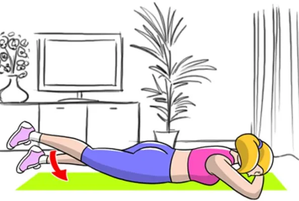 (www.melarossa.it) Sulla pancia: Distesa sulla pancia con la fronte appoggiata sulle mani, gambe tese e alluci a terra, contrai i muscoli del gluteo destro e alza la gamba destra tesa espirando. Abbassa la gamba senza toccare terra e sollevala di nuovo, espirando, per 10 volte. Attenzione a non muovere il bacino e a non contrarre la nuca. Fai 2 serie da 10 ripetizioni per ogni gamba. Illustrazione: Marcello Carriero