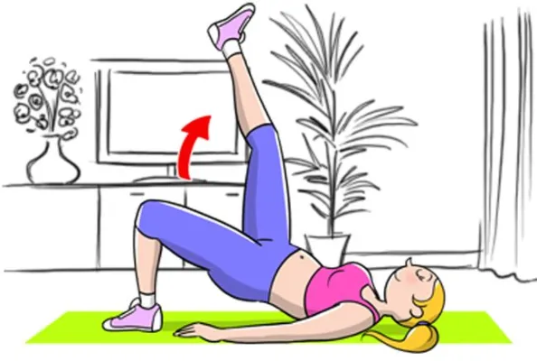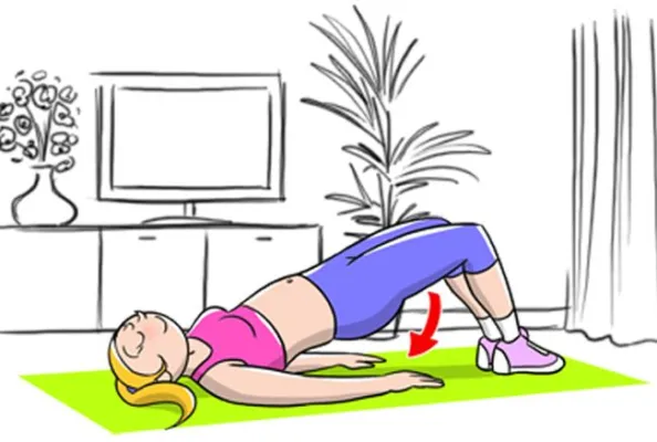 (www.melarossa.it) Solleva il bacino: Distesa sulla schiena, con i piedi a terra aperti alla larghezza bacino, le braccia lungo il corpo e i palmi delle mani appoggiati sul pavimento, solleva il bacino contraendo i glutei e tieni la posizione per 15 secondi. Attenzione a non sollevare la testa per non contrarre le cervicali e a non arcuarla. Il corpo deve essere dritto come una tavola. Per aumentare la difficoltà, esegui lo stesso esercizio con caviglie e ginocchia che si toccano. Fai 3 serie da 12 ripetizioni. Illustrazione: Marcello Carriero
