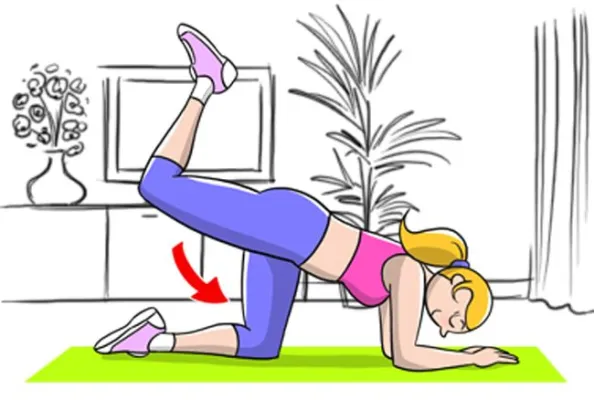 (www.melarossa.it) Sui gomiti: In ginocchio con i gomiti a terra, la pancia in dentro, solleva la gamba destra e piegala a 90 gradi. Il ginocchio deve essere allineato al bacino. Tieni la posizione per 10 secondi Attenzione a tenere sempre la pancia in dentro, a non muovere il bacino e a non alzare la testa. Fai 2 serie da 10 ripetizioni per ogni gamba. Illustrazione: Marcello Carriero