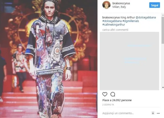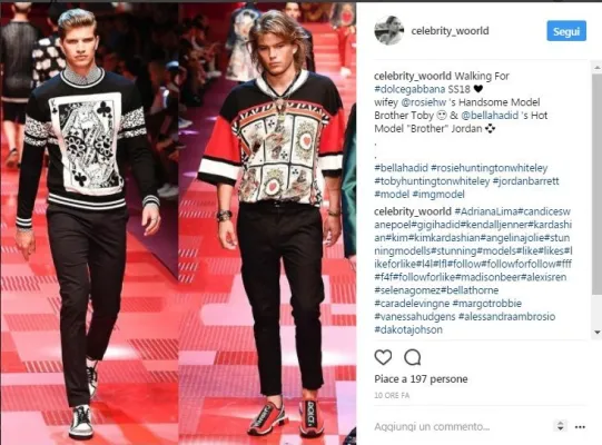 I millennial sono i protagonisti della sfilata di Dolce & Gabbana. In totale 106 «re di cuori» (la sfilata si chiama «King of hearts» per l?occasione sono stati reclutati i più affascinanti figli di, da Presley Gerber, il figlio di Cindy Crawford, Jordan Barrétt, il modello australiano balzato alle cronache (rosa) per una sua presunta relazione con Bella Hadid, Alain Fabien Delon (figlio dell?attore Alain Delon), Farrerty Law (figlio di Jude Law) Braison Cyrus (fratello di Miley) e Roberto Rossellini (figlio di Isabella Rossellini), tra le giovani e promettente modella Sisitine Stallone, figlia di Sylvester Stallone.
