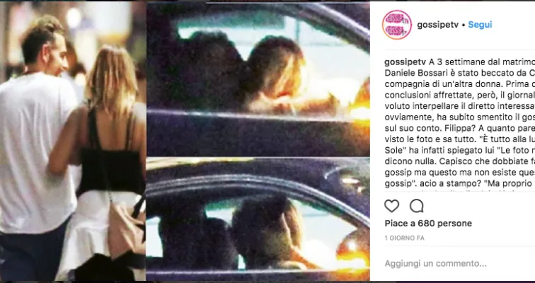 La storia d'amore tra Filippa Lagerback e Daniele Bossari, nata oltre venticinque anni fa e coronata da un matrimonio celebrato un mese fa, ha fatto sognare tantissime persone. Naturale quindi che le foto pubblicate dal settimanle "Chi" e condivise su Instagram dall'account GossipeTv abbiano sorpreso tutti. Nelle immagini si vede Daniele Bassari in compagnia di una donna con i capelli biondi e lunghi. E in altre due immagini si vedono i due salutarsi dentro la macchina: un abbraccio, un bacio e un gioco di prospettive che a volte possono essere ingannevoli. Nessun tradimento. E a chiarirlo subito è lo stesso Bossari che interpellato a proposito ha detto: "È solo un'amica, eravamo con altre persone a ricordare le mie nozze, in macchina ci stavamo solo salutando, sarà durato in tutto 20 secondi, Filippa sapeva di questa mia uscita, e non ho bevuto alcol".