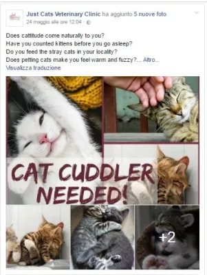 Per molti è un sogno che si avvera, a Dublino una clinica veterinaria ha recentemente postato sulla propria pagina facebook un annuncio per la ricerca della figura professionale di coccolatore di gatti.