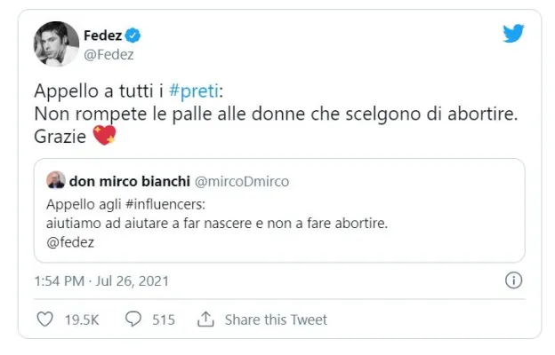 "Appello a tutti i preti: non rompete le palle alle donne che scelgono di abortire. Grazie". Lo scrive sul suo profilo Twitter Fedez replicando al tweet di don Mirco Bianchi che aveva scritto: "Appello agli influencers: aiutiamo ad aiutare a far nascere e non a fare abortire".