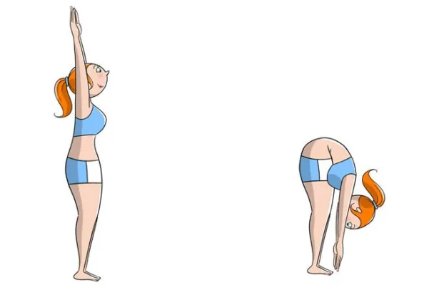 (www.melarossa.it) La posizione della pinza per allungare. Mettiti in piedi, con le gambe parallele e leggermente piegate e le braccia tese verso il cielo. Inspirando, abbassa lentamente testa e braccia e continua gradualmente a flettere in avanti il busto, scendendo verso il basso, senza forzare troppo il tuo corpo. Tieni la schiena concava in modo da sentire ogni vertebra della tua colonna. Espira. Mantieni la posizione per 3 cicli di respiro. Poi espira profondamente e lentamente risali con la pancia in dentro e la schiena curva. Illustrazioni: Marcello Carriero