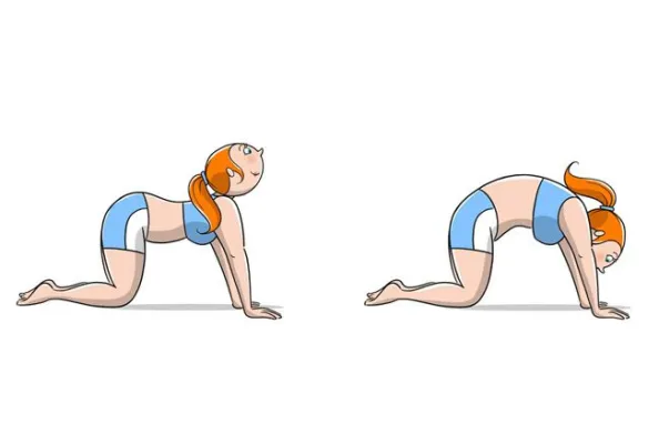 Assumi la posizione a quattro zampe, mantenendo mani e ginocchia in asse con spalle e anche. Inspirando inarca la schiena verso l'alto contraendo gli addominali verso l'interno. Solleva dorso e spalle e rilassa il collo verso il basso. Espirando, rilassa la zona lombare, fai scendere l'addome verso il basso, apri il petto e ruota la testa all'indietro senza fare troppa pressione sulle vertebre lombari e cervicali.