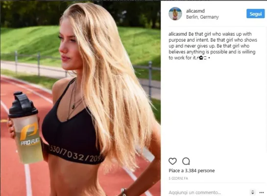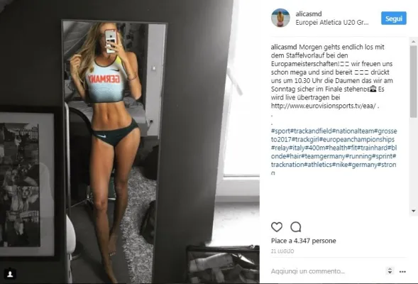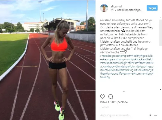 Si chiama Alica Schmidt, ha 18anni ed è una delle più grandi promesse dell'atletica leggera tedesca. La giovane atleta non è sono brava ma è anche bellissima, la rivista australiana Busted Coverage l'ha incoronata l'atleta più bella del mondo. Alica potrebbe partecipare alle prossime Olimpiadi di Tokio previste per il 2020, per ora grazie alla sua bellezza è stata adocchiata dai grandi brand di abbigliamento sportivo e ha già sottoscritto un contratto con la Puma. Foto Instagram