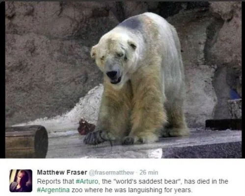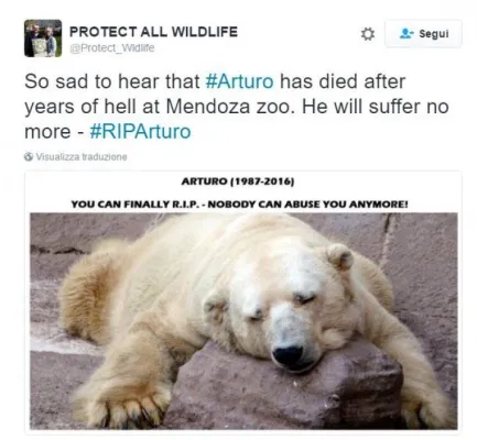 Aveva 31 anni e dal 1993 si trovava allo zoo di Mendoza, in Argentina. Rimasto solo dal 2012 per la morte della sua "compagna", l'orsa Pelusa, Arturo ha sempre dovuto soffrire calde temperature (con picchi superiori a 30°C) e aveva solo una vasca in cui rinfrescarsi, peraltro troppo piccola per la sua stazza. Attivisti e animalisti hanno chiesto a più riprese il suo trasferimento presso una struttura più adeguata: la volontà era quella di portarlo in una riserva in Canada dove avrebbe trovato un clima decisamente più favorevole.