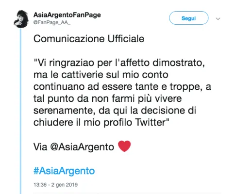 Anno nuovo, vita nuova. E possibilmente alla larga dai social e dalle loro cattiverie. È quello che ha deciso di fare Asia Argento (in questa prima immagine è con la figlia Anna Lou alla première de "I Moschettieri del Re"), da oltre un anno al centro di una campagna mediatica che l’ha vista trasformarsi da accusatrice ad accusata e infine a vittima. L’attrice e regista, stanca delle critiche e dei commenti velenosi degli hater ha deciso di cancellare il suo account di Twitter. “Vi ringrazio per l’affetto dimostrato ma le cattiverie sul mio conto continuano a essere tante e troppe. A tal punto da non farmi più vivere serenamente. Da qui la decisione di chiudere il mio profilo Twitter”, scrive Asia nell’occhio del ciclone da quando ha accusato di molestie e violenza sessuale il produttore americano Harvey Weinstein ed è diventata una delle paladine mondiali del Movimento #MeToo. Lo scorso agosto, dopo il grande dolore per il suicidio del compagno, è stata invece lei a subire le accuse di molestie da parte di un giovane attore americano, Jimmy bennett. Da lì la decisione di Sky Italia, controversa e criticata da molti, di eliminare Asia dalla giuria di X-factor. Infine, la “liason dangereuse” con Fabrizio Corona. Ora Asia cerca di riacquistare un po’ di serenità lontano dal clamore mediatico. Come darle torto?