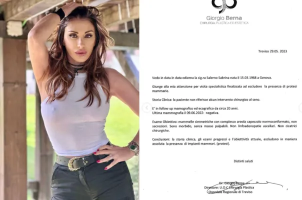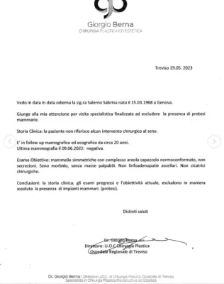 Sabrina Salerno vuole mettere fine alla "fake news che mi perseguita da più di 30 anni" sul suo seno. E per farlo posta su Instagram la perizia del chirurgo con le conclusioni in cui si legge: "La storia clinica, gli esami pregressi e l'obiettività attuale, escludono in maniera assoluta la presenza di impianti mammari (protesi)". La showgirl 55 anni posta il referto del chirurgo, datato 29 maggio 2023. "Giunge alla mia attenzione per visita specialistica finalizzata ad escludere la presenza di protesi mammarie - si legge - Storia Clinica: la paziente non riferisce alcun intervento chirurgico al seno. E’ in follow up mamografico ed ecografico da circa 20 anni. Ultima mammografia il 09.06.2022: negativa. Conclusioni: la storia clinica, gli esami pregressi e l’obiettività attuale, escludono in maniera assoluta la presenza di impianti mammari (protesi)". "Spero, con questo documento, di aver messo la parola fine a una fake news che mi perseguita da più di 30 anni", scrive la showgirl postando diverse sue foto oltre al certificato medico.