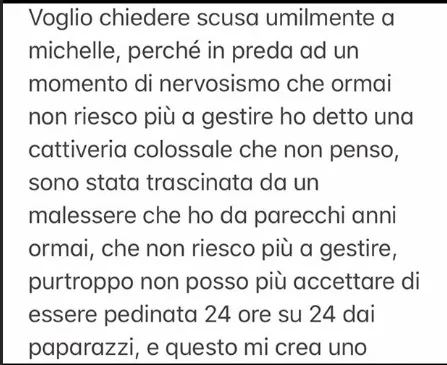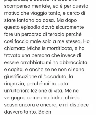 Immediatle scuse dell'argentina verso la collega svizzera con la quale in passato ha condiviso la conduzione di "Striscia la notizia" : "Ho detto una cavolata ma non riesco più a gestire questo nervosismo", ha scritto Belen in una storia sul suo profilo ufficiale su Instagram. Ecco il messaggio completo: "Voglio chiedere scusa umilmente a Michelle perché in preda ad un momento di nervosismo che ormai non riesco più a gestire ho detto una cattiveria colossale che non penso. Sono stata trascinata da un malessere che ho da parecchi anni ormai, che non riesco più a gestire, purtroppo non posso più accettare di essere pedinata 24 ore su 24 dai paparazzi. E questo mi crea uno scompenso mentale, ed è per questo motivo che viaggio tanto, e cerco di stare lontana da casa.Ma dopo questo episodio dovrò sicuramente fare un percorso di terapia perché così faccio male solo a me stessa. Ho chiamato Michelle mortificata, e ho trovato una persona che invece di essere arrabbiata mi ha abbracciata e capita, e anche se non ci sono giutificazioni per l'accaduto, la ringrazio, perché mi ha dato un'ulteriore lezione di vita. Me ne vergogno come una ladra, chiedo scusa ancora e ancora, e mi dispiace davvero tanto. Belen. Un'ultima cosa: con questi paparazzi non mi scuso: mai".