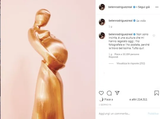 Immediatamente tra i fan si è diffusa la convinzione che la showgirl argentina fosse incinta e che il piccolo Santiago stesse per avere un fratellino. Una fake news che si è propagata a macchia d'olio al punto che la stessa Belen si è sentita in dovere di precisare come stanno realmente le cose: "Non sono incinta, è una scultura che mi hanno regalato oggi, l’ho fotografata e l’ho postata, perché la trovo bellissima. Tutto qui!", ha scritto tra le migliaia di commenti. Lasciando a bocca asciutta i tantissimi sostenitori della coppia Rodriguez-De Martino che non vedono l'ora di rivederli con un bebé tra le braccia.
