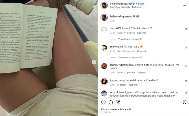 Altra pioggia di critiche per uno scatto postato in vacanza mentre legge un libro dell'autrice Marilù Oliva. "Ma perché sfoggi un libro", "Ma perché leggi?", "Che foto inopportuna".