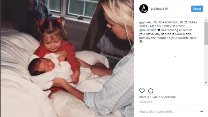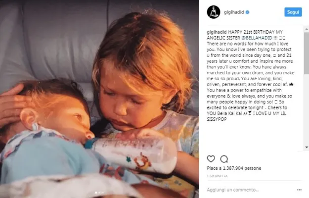 Seguitissime entrambe sui social hanno festeggiato insieme il compleanno, Gigi per l'occasione ha voluto omaggiare la sorella con un tenerissimo post su Instagram: "Buon compleanno angelo mio, non ci sono parole per definire il mio amore per te. Ho cercato di proteggerti fin dal primo giorno e ora, a distanza di 21 anni, mi dai conforto e mi ispiri più di quanto possa immaginare. Sei amorevole, gentile e sai essere empatica e capace di donare amore. Sono felice di festeggiare con te questa sera." Foto Instagram