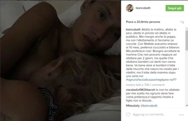 È bastato che Bianca Balti pubblicasse su Instagram una foto mentre in spiaggia allattava la sua piccola di 10 mesi per scatenare un putiferio di critiche: c'è stato chi l'ha accusata di sbandierare sui social un momento molto intimo e chi invece ha avuto da ridire perché la bambina sarebbe troppo grande per l'allatamento al seno. Così la bellissima top model ha deciso di rispondere alle critiche e ha pubblicato un lungo post: "Allatto la mattina, allatto la sera, allatto in privato ed allatto in pubblico. Mia mangia anche la pappa, ma con l'allattamento ci facciamo le coccole. Con Matilde avevamo smesso ai 10 mesi, preferiva ciucciotto e biberon. Mia preferisce così. Bisogna accettare le mamme che non provano neppure ad allattare per 2 giorni, ma quelle che allattano bambini coi denti non vanno bene. Va bene dare ai bambini il latte delle mucche che natura ha creato per i vitellini, ma il latte della mamma dopo una certa no!". Il tutto sottolineato dall'hashtag un po' aggressivo ma sicuramente efficace: #ognunofacciailcazzocheglipare. Foto instagram @biancabalti