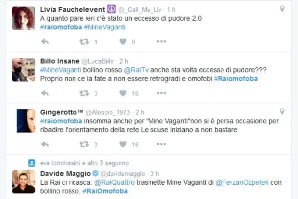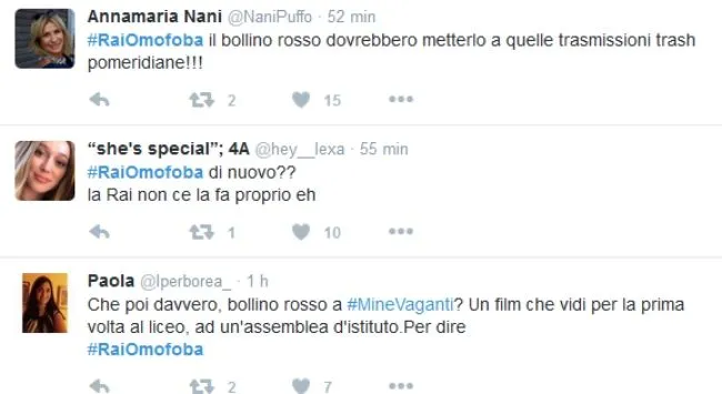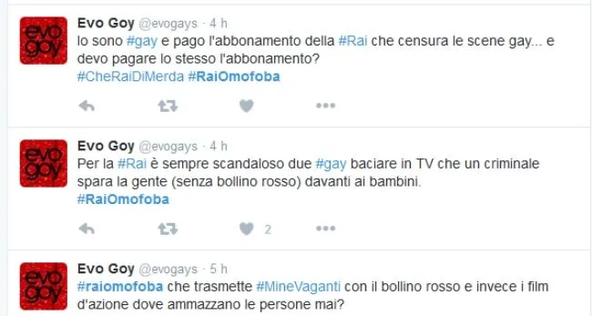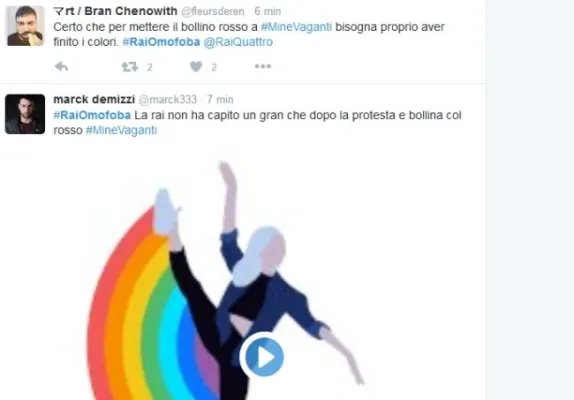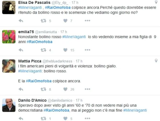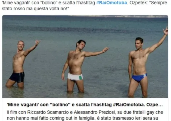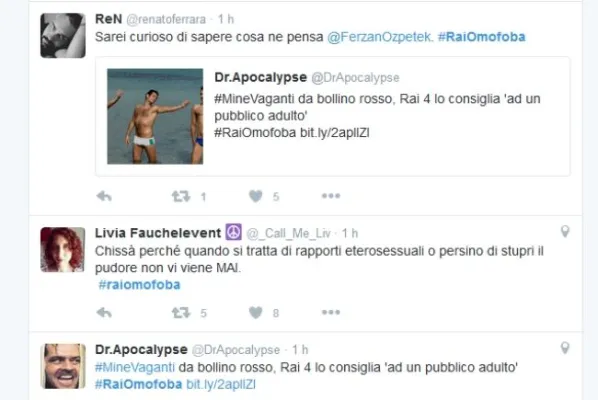 L'omosessualita' di Tommaso (interpretato da Riccardo Scamarcio), pugliese trapiantato a Roma che vive senza rimorsi o sensi di colpa. E gli affari familiari che lo riportano in Salento, dove dovra' confrontarsi con tutti i parenti piu' prossimi e con la reale sincerita' della sua serenita'. Mandato in onda su Rai 4, "Mine Vaganti" di Ferzan Ozpetek e' stato contrassegnato con il bollino rosso, quello riservato a film con contenuti molto violenti, scabrosi e disturbanti. Ma nella pellicola non c'e' niente di tutto questo. Come hanno fatto notare molti telespettatori inferociti su Twitter, con l'hashtag #raiomofoba.