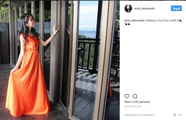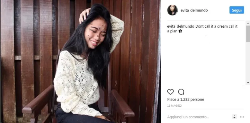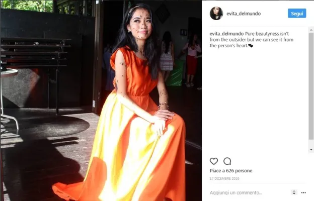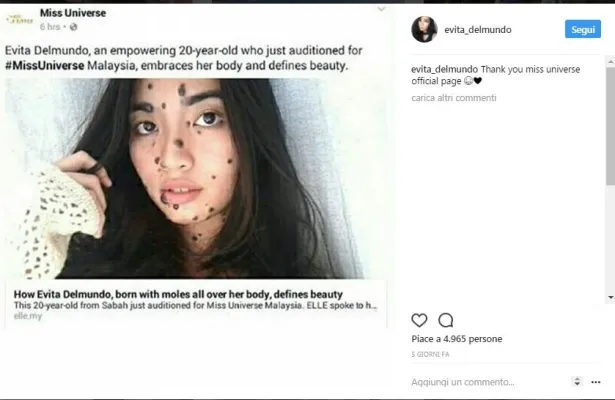 E' stata schernita per anni dai suoi compagni per il suo aspetto, Evita Delmundo è una ragazza malesiana di 20 anni con il corpo completamente ricoperto da grandi nei pelosi. Ha passato la sua infanzia sognando di rimuovere quelle protuberanze che le impedivano di avere una vita normale ma essendo l'intervento molto rischioso per la sua salute, all'età di 16 anni ha deciso di accettarsi così e oggi ha un ottimo rapporto con il suo corpo. La maturata fiducia in se l'ha portata persino ad iscriversi per il concorso di bellezza "Miss Malesia" grazie al quale spera di diventare reginetta. In un'intervista per Elle Malesia, Delmundo ha spiegato la sua definizione di bellezza: "La bellezza non è solo esteriore; non è solo un viso o un corpo perfetto. La bellezza è ciò che sei e quanto ti ami. Non riguarda mai la perfezione". Foto Instagram