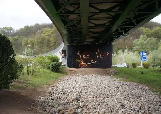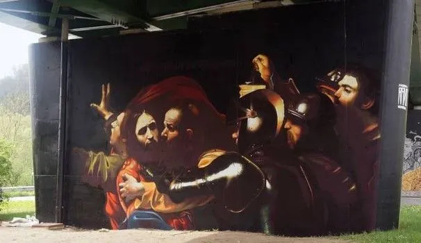 "La cattura di Cristo", riproduzione "street" del Caravaggio. Si trova sotto un cavalcavia di Varese, città natale di Andrea Ravo Mattoni.