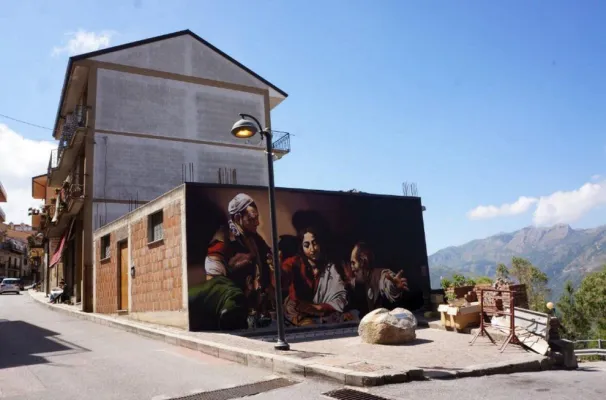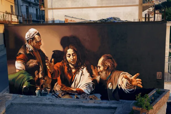 Riproduzione della "Cena in Emmaus" del Caravaggio, il cui originale è custodito alla National Gallery di Londra. La versione "street" abbellisce un muro del paese di San Salvatore di Fitalia, in provincia di Messina.