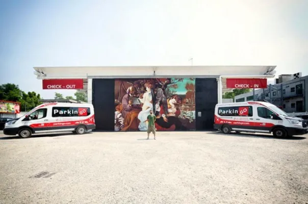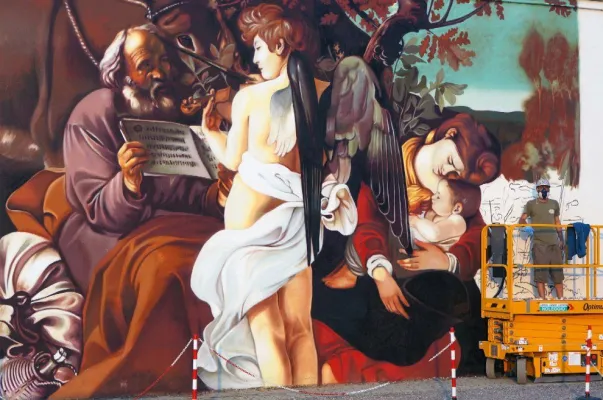 "Riposo durante la fuga in Egitto", versione "street" dell'opera di Caravaggio. Abbellisce un muro del Parkingo dell'aeroporto di Malpensa, Milano. L'originale si trova nella Galleria Doria Pamphilj di Roma.