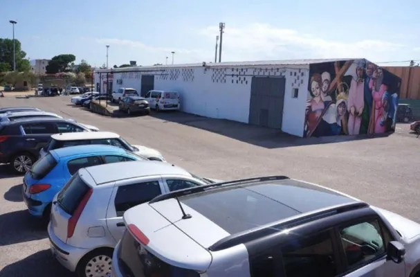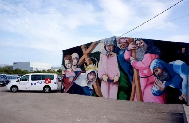 Riproduzione di un particolare del dipinto cinquecentesco "Il ritrovamento della Vera Croce" dell'artista sardo conosciuto come il Maestro di Ozieri. Il muro dipinto si trova al parcheggio ParkinGo dell'aeroporto di Olbia.