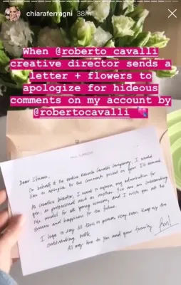 A distanza di pochi giorni, a prendere le distanze da quel commento è stato Paul Surridge, direttore creativo di Cavalli, che ha inviato un mazzo di fiori e un biglietto di scuse alla Ferragni: “Cara Chiara, a nome di tutta la Roberto Cavalli Company, vorrei scusarmi per il commento pubblicato sul tuo account Instagram. Come direttore creativo vorrei esprimere la mia ammirazione per te, come professionista e come madre. Sei un modello per le giovani donne e ti auguro successo e felicità per il futuro. Spero di poterti dire presto tutto questo di persona”.