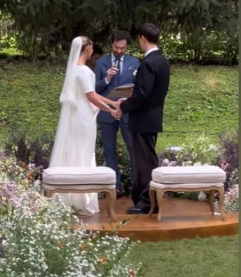 Per la prima parte della giornata ha scelto di essere elegante, con una creazione romantica e molto delicata, un vestito di seta con ampia scollatura e due applicazioni floreali all'altezza delle spalle. Look più sobrio e sbarazzino per il party nuziale, così da potersi divertire comodamente tra il taglio della torta e i momenti musicali. La sposa stessa, per questa parte della serata, ha scelto dei look più moderni. La testimone messo da parte l'abito lungo ha puntato poi su quello corto, un minidress strapless con gonna a palloncino e applicazioni floreali scintillanti.