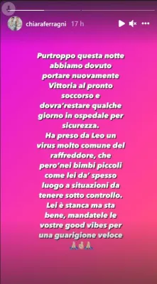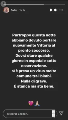 "Purtroppo questa notte abbiamo dovuto portare nuovamente Vittoria al pronto soccorso. Dovrà stare qualche giorno in ospedale sotto osservazione, si è presa un virus molto comune tra i bimbi. Nulla di grave, è stanca ma sta bene".