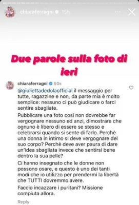 Giulia Dedola, 11 anni e campionessa di equitazione, ha così commentato: «Bho io ho 11 anni ( quasi 12) e se vedo ragazzine di 15 anni che si fanno ste foto penso che sinceramente siano inadeguate a maggior ragione che senso ha che lo faccia tu? Cioè a parte che in questa foto non fai vedere vestiti o costumi da bagno ma praticamente te stessa nuda. Qual è il messaggio per noi ragazzine? Che per farci notare dobbiamo metterci nude? Io non lo trovo un bel messaggio da mandare, compro tante cose tue quaderni costumi da bagno vestiti, mi piacciono molto però ultimamente trovo che tante foto sono diventate volgari danno messaggi sbagliati non c'è un senso a questa foto. Mia mamma ha 34 anni e le foto in costume al mare le mette ho una bella mamma ma se mettesse una foto così io mi sentirei malissimo penserei che mi devo vergognare del suo comportamento non ne sarei per niente fiera. So che non leggerai le parole di una ragazzina però la vitto (la figlia Vittoria, ndr) avrà la mia età tra non tantissimi anni e queste sono foto che restano per sempre su internet non penso sia qualcosa di cui andare fieri far vedere il culo così. Scusa ma questo è il mio pensiero».