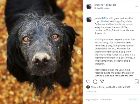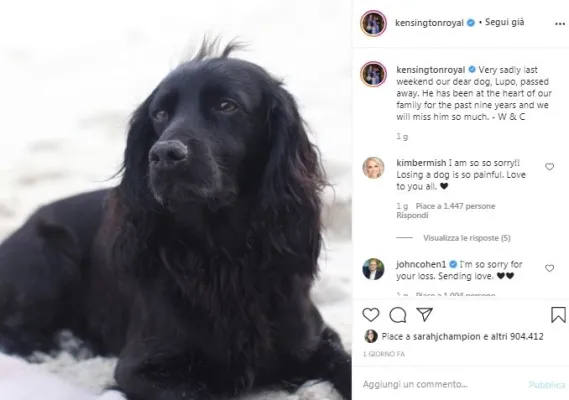 Anche il fratello di Kate, James, che ha il resto della cucciolata di cui faceva parte Lupo, ha voluto dedicare un lungo post al cane scomparso: "È con grande tristezza che comunico che è morto Lupo, l'amatissimo cane di mia sorella Catherine e della sua famiglia. Lupo era il figlio di Ella, fratello di Zulu, Inka e Luna. Aveva 9 anni. Niente potrà mai prepararti alla perdita di un cane". ha scritto.
