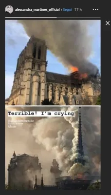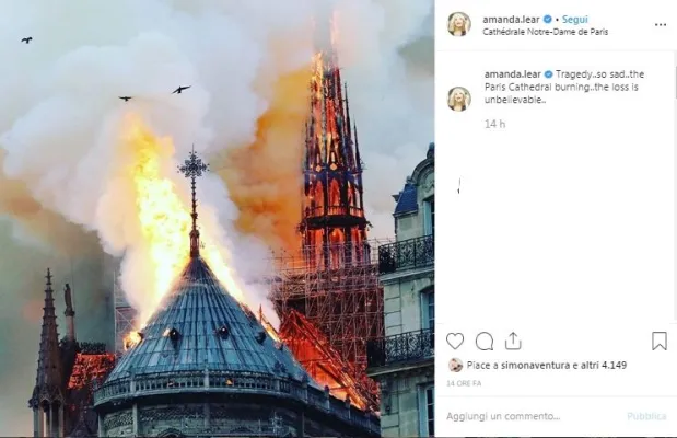 Amanda Lear, che ha doppia nazionalità, francese e inglese, ma che è stata praticamente adottata dall’Italia, ha scritto: Tragedy..so sad.. the Paris Cathedral burning… the loss is unbelievable…”, ovvero: “Tragedia ... così triste ... il Duomo di Parigi brucia ... la perdita è incredibile ...”.