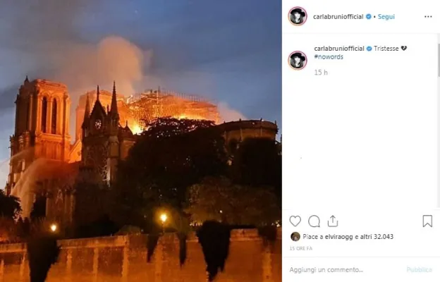 L’ex première dame Carla Bruni, piemontese di nascita ma francese d’adozione, ha fatto conoscere sui social il suo sgomento pubblicando una foto della cattedrale gotica in fiamme e scrivendo semplicemente “tristesse”, con un cuore spezzato. Anche l’attrice ed ex ballerina Alessandra Martines, nata a Roma ma naturalizzata francese dopo il matrimonio con il regista Claude Lelouch, ha pubblicato sul suo Instagram due scatti del tetto divorato dall’incendio: “Sto piangendo”.