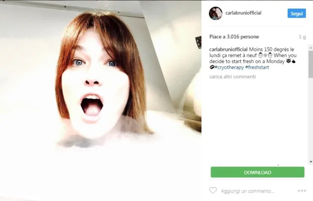 L'ex Première dame di Francia ha postato di recente uno scatto su Instagram in cui la si vede mentre si sottopone alla terapia: «Meno 150 gradi il lunedì, ciò mi rimette a nuovo scrive nella didascalia dello scatto. Quando tu decidi di cominciare il lunedì con freschezza.