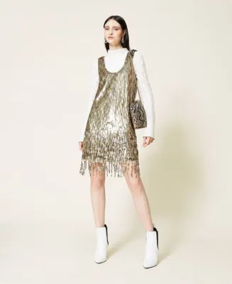 Non si passa inosservate scegliendo l'abito corto a canotta, in tessuto ricamato a mano con paillettes di diverse dimensioni e sfumature. Linea diritta, profili rifiniti in crepe de chine frange di paillettes applicate a mano al fondo, foderato. S' indossa da solo o sopra a un dolcevita per un look di tendenza.