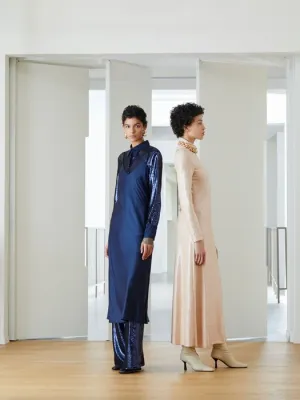 Anche Liviana Conti suggerisce l'abito midi in lurex e paillettes color oro, con maniche lunghe e collo ad anello, oppure, il completo blu zaffiro, composto da camicia con maniche ricoperte di paillettes come i pantaloni, sopra, una lunga sottoveste in raso ton sur ton.