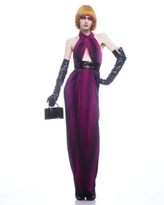 Vogliamo proprio stupire tutti, allora scegliamo l'abito lungo di Moschino disegnato da Jeremy Scott, lungo con scollo all'americana, viola e nero, che fa tanto Blade runner se abbinato a trucco da replicante e guanti in lattice lunghi.