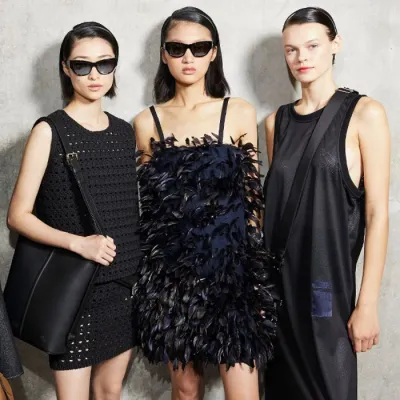 Più cautamente Twinset comincia col proporre la fantasia bandana in rosso e nero per Natale. Poi sfodera l'abito corto anni Settanta in misto lana, con dettagli rifiniti da borchie, fondo in georgette con balza in crepe de Chine, frange lucide, scollatura a V, maniche lunghe e linea diritta. Nella foto l'abito viene abbinato a stivali in camoscio alti, bordati con frange. Molto rock.