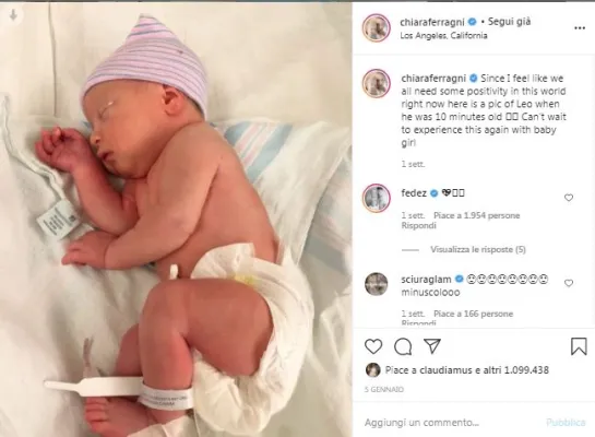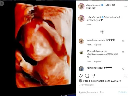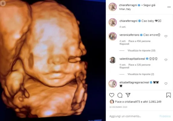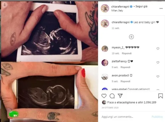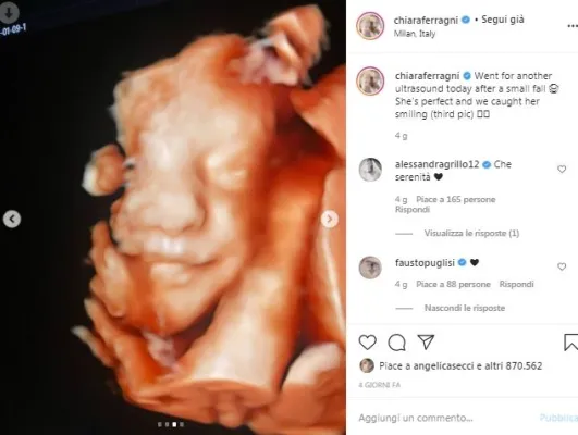 L'ecografia era stata fatta dopo una piccola caduta di Chiara per fortuna senza conseguenze. Lei stessa aveva raccontato i fatti su Instagram: «Ieri ho fatto una piccola caduta mentre camminavo nella natura (senza farmi nulla) ma in gravidanza non si sa mai quindi oggi ho fatto un'altra visita di controllo». Subito i fan le hanno tributati commenti e felicitazioni, producendosi in un totoscommesse del nome.