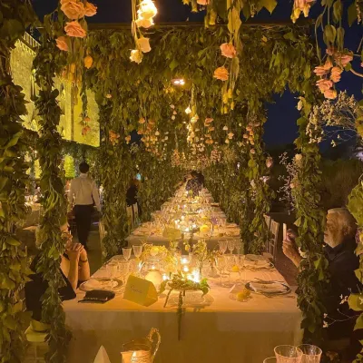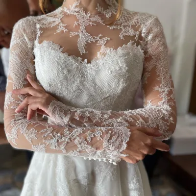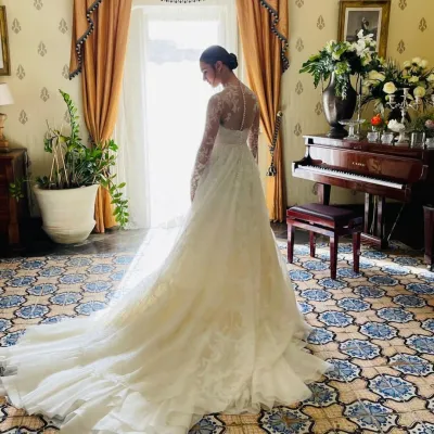 Per la cena e il taglio della torta Miriam ha scelto invece un abito da favola: “Volevo ospitare i nostri ospiti (I NOSTRI AMICI STUPENDI CHE AMIAMO e ringraziamo di cuore ? !!!) come in un sogno sì, ma anche come in una casa di una volta attraverso questo abito con gonna a ruota un po' classico anni '50 con ricamo di mughetto (fiore legato alla sposa) e spighe di grano (stesso motivo dell'abito della Chiesa)… anche questo tutto ricamato a mano con una maestria incredibile (da nipote di ricamatrici ho ammirato il lavoro artigianale sempre con occhi a cuore e infinita gratitudine!!!) @dior ha anche realizzato per me una corona che ho indossato come “cerchietto” ho chiesto che le pietre erano azzurre perché, non so se lo sapete, la sposa deve indossare anche qualcosa di azzurro… ho cambiato le scarpe,slingback come in Chiesa (dopo ve le posto) con lo stesso ricamo dell'abito … infine abbiamo aggiunto uno “sciallitto” in omaggio alle nostre nonne siciliane che ne avevano sempre uno poggiato sulle spalle nelle sere umide d'inverno…