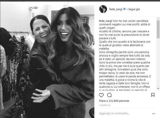 "Non ho mai voluto cancellare commenti negativi sui miei profili, aldilà di quelli volgari. Accetto le critiche, servono per crescere e non ho mai avuto la presunzione di dover piacere a tutti. Quello che non accetto è la faciloneria con la quale al giudizio viene abbinata la malattia.
